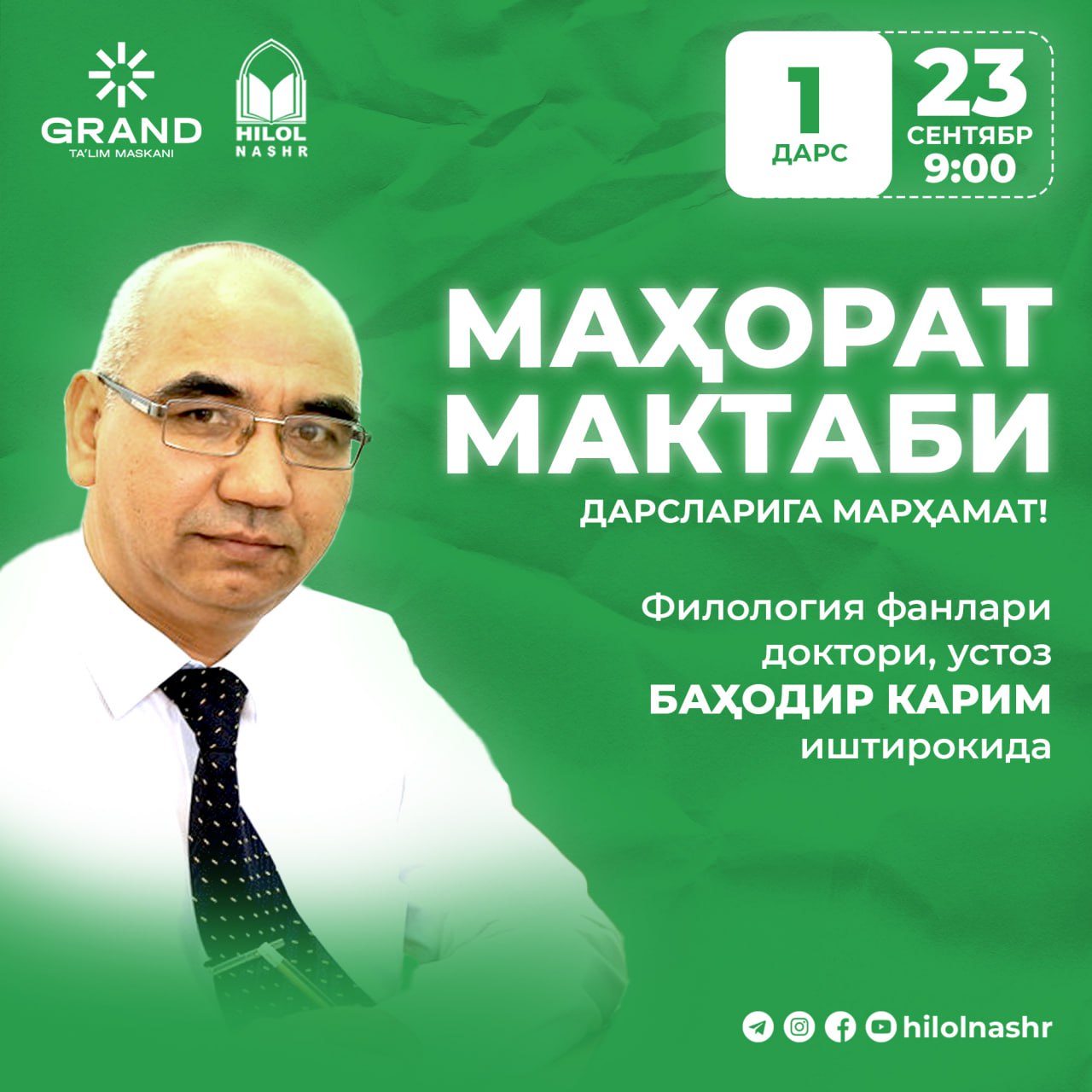 Siz azizlarga «Hilol Nashr» tahririyati hamda «GRAND taʼlim» o‘quv maskani qoshida tarjima va tahrir sohasiga oid «Mahorat maktabi» ochilganini eʼlon (https://t.me/HilolNashr/16311) qilgan edik.